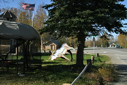 BLOWN OVER— Wind gusts on Friday were strong enough to topple a 9-foot plywood moose decoration in downtown Talkeetna. Signs of businesses, the wooden VFW post sign and political campaign signs were also damaged during the storm. Photo by Diana Haecker