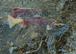 I watched the males sparring-lunging at each other with their jaws agape, showing rows of teeth. They undergo a marvelous transformation just before spawning time, the males growing long, hooked noses and jaws lined with impressive teeth. They don’t tear into each other, however, all this armor is more for show. They knock into each other, pushing bodies away in shows of strength as they defend their chosen female and her spawning bed. Even long after the spawning is over, the ritual will still be performed, with the fish growing weaker each day, until at last they no longer push into each other, but just rest, facing up the current, waiting until they can no longer do even that. Then will come the final moment when at last they surrender to the current and let it carry them downstream, to fetch up against a log, or lay on a shallow bed of stones, breathing their last.