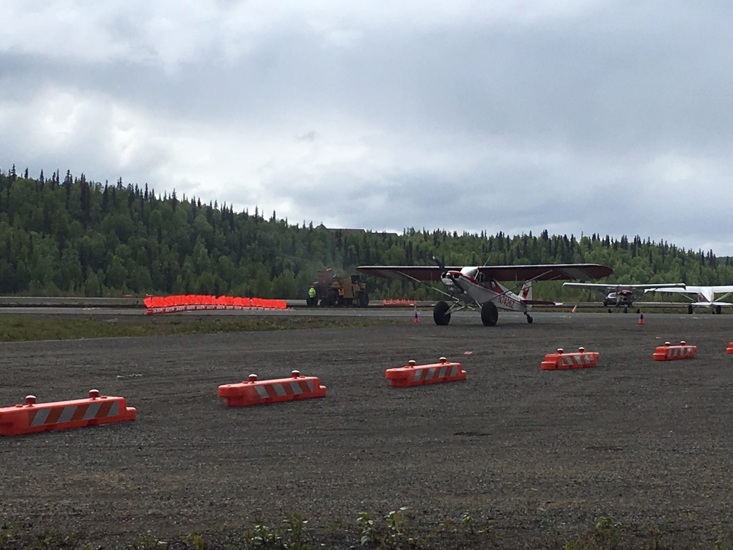 An aircraft uses the temporary taxiway at Talkeetna State Airport as paving work gets ready to begin. Photo by Katie Writer – KTNA
