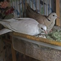 Sweetpea would lay two eggs, and the pair would take turns sitting on the eggs for about a month. I candled the eggs after a few days; always they were not viable. I concluded that someone was sterile. I suspected Piper, because he’s an albino. When the eggs didn’t hatch at the end of the month, the Doves would abandon them. I would remove them from the nest. Then would begin about a week of courting. The pair would go through a display of feeding each other, grooming each other, wing- vibrating, and cooing, culminating with the Doves taking turns climbing on top of each other. Then they would preen themselves simultaneously for a few minutes. Then the display would begin again. They were free to come and go 24/7, and so explored the cabin together during the week they were courting. Because they are ground-feeding birds in Nature, I had to watch where I was walking, for often they would be walking on the floor of the cabin together. The dogs, being Herding Shepherds, largely ignored them, even when the Doves would climb onto their backs while they laid dozing on the floor.