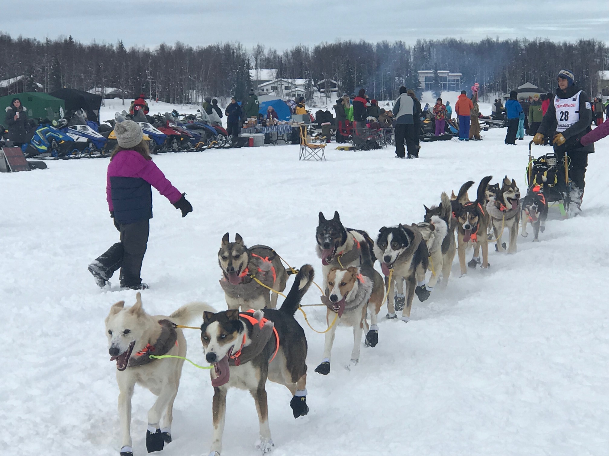 2018 Iditarod champion Joar Leifseth Ulsom of Norway mushes through “trailgaters” on Long Lake in Willow. Photo by Katie Writer.