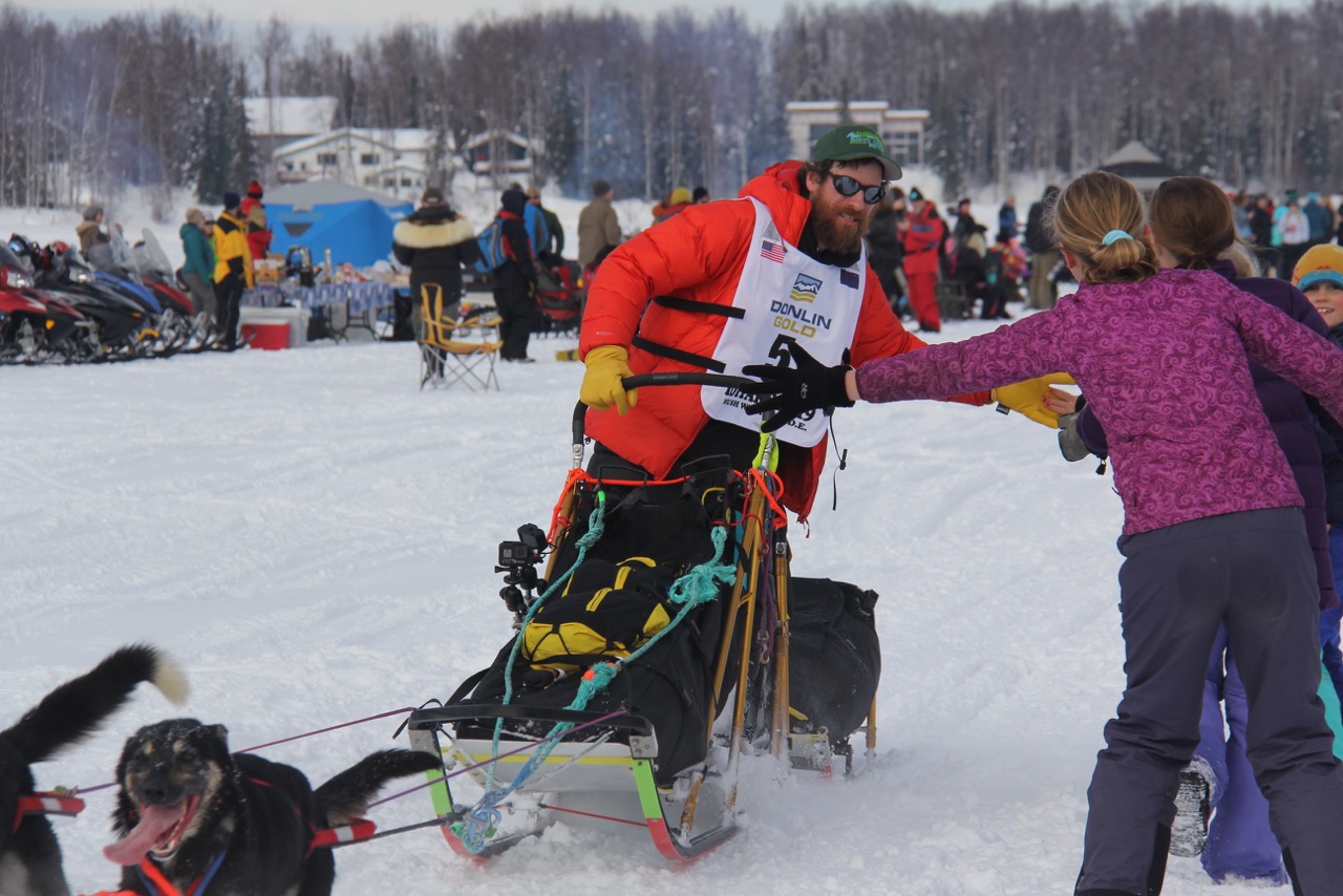 Jessie Holmes of Nenana high-fives “trailgaters” on Long Lake in Willow after the start of the 2019 Iditarod. Photo by Katie Writer.