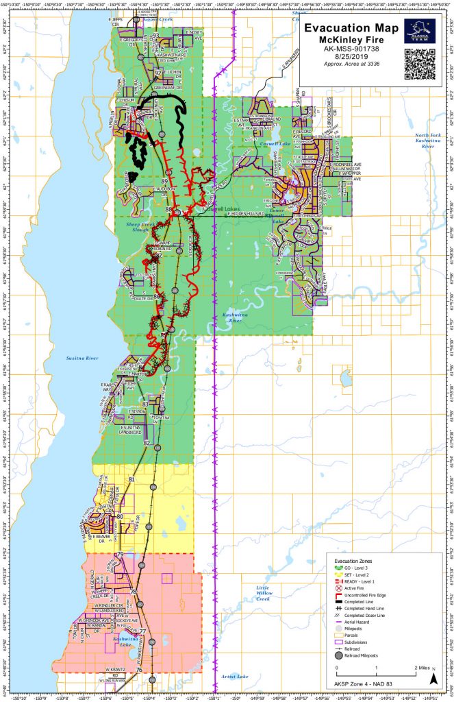 As of Sunday evening, the Level 3: “Go” evacuation order remained in effect for residences between Mile 81.5 and Mile 92 of the Parks Highway. A Level 2: “Set” evacuation remains in effect for Mile 79 to Mile 81.5. A “Set” evacuation notice means residents should be prepared to leave their homes within minutes if the situation worsens. A Level 1: “Ready” notice was in effect for Mile 76 to Mile 79. A “Ready” notice means residents should have an evacuation kit and plan prepared.