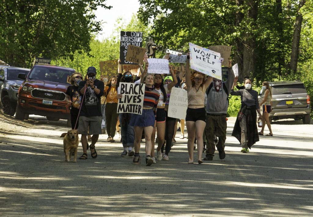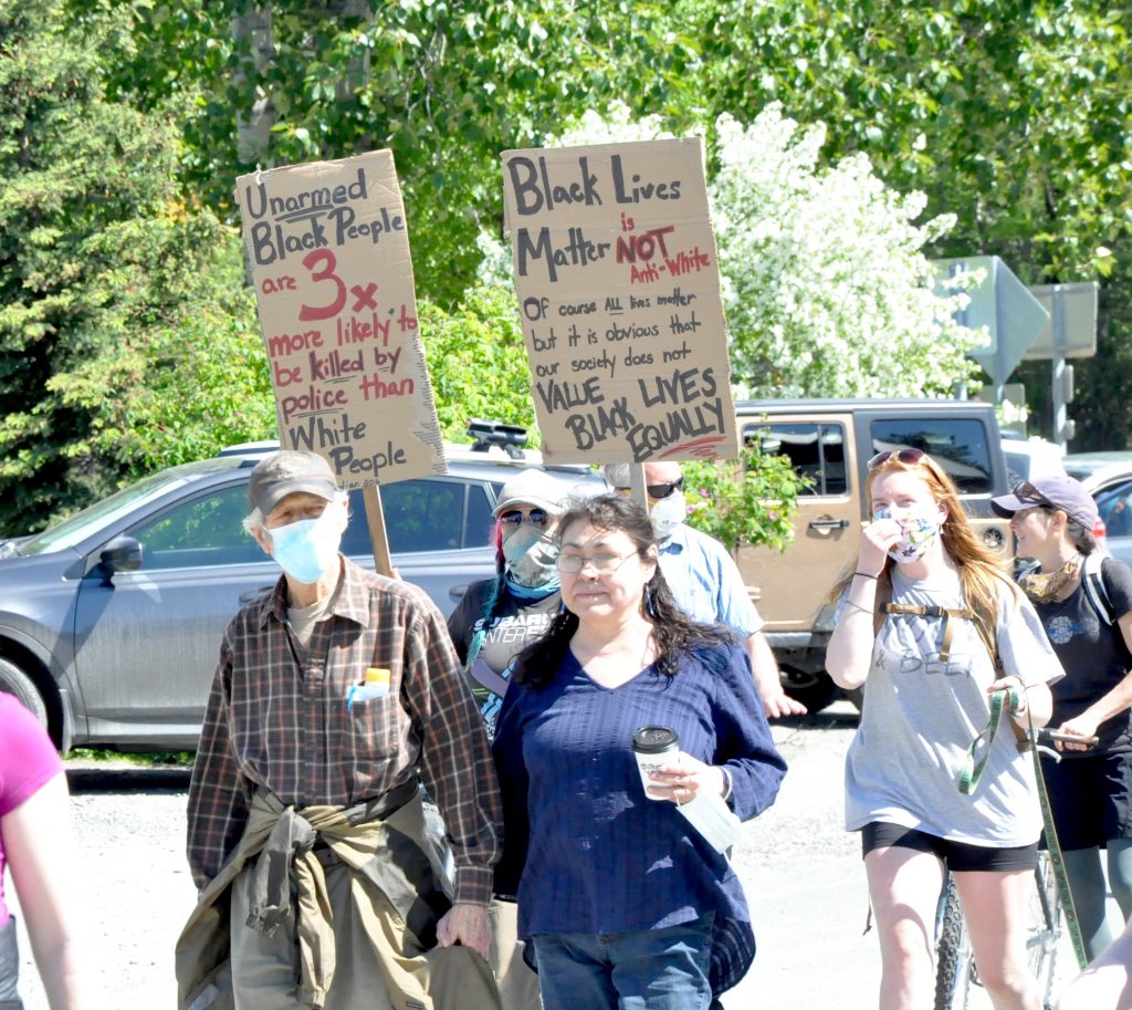 As is tradition with parades and marches in Talkeetna, there were multiple laps of Main Street. Indigo and Abigail say they were concerned that violence might flare up as it has in other protests around the country, but the crowd, both participants and bystanders, remained peaceful.