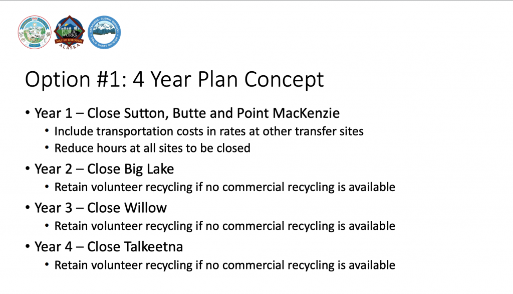 Near the end of January, Borough Manager Mike Brown’s weekly post (pdf link) on the Mat-Su Borough website included five options for reducing costs of the borough’s Solid Waste Division, which operates the central landfill and transfer sites throughout the Valley. Of those five options, the one spelled out in detail would involve closing multiple transfer sites, including in Willow and Talkeetna, over the course of four years. Many locals who saw the plan shared on social media expressed concern about the potential of the sites closing.