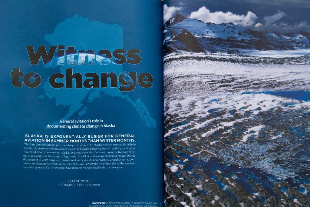 Through flying and snapping photos, Katie accumulated a fairly large collection of climate-themed work. Then COVID hit and Katie used her time to organize and document her work.  She wrote a feature article for Aircraft Owners and Pilots Association (AOPA) magazine and submitted some of her photos.  The magazine not only published the story; it recently won third place for “Best Feature Story” from the Alaska Press Club this year.  Katie says she feels grateful to be able to tell her story.