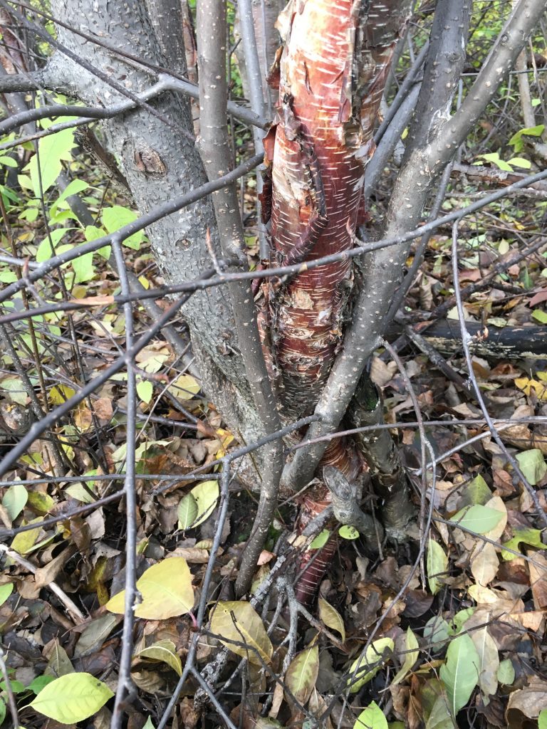 A Mayday Tree (also called a chokecherry) literally chokes out a birch tree. Photo courtesy Tim Stallard