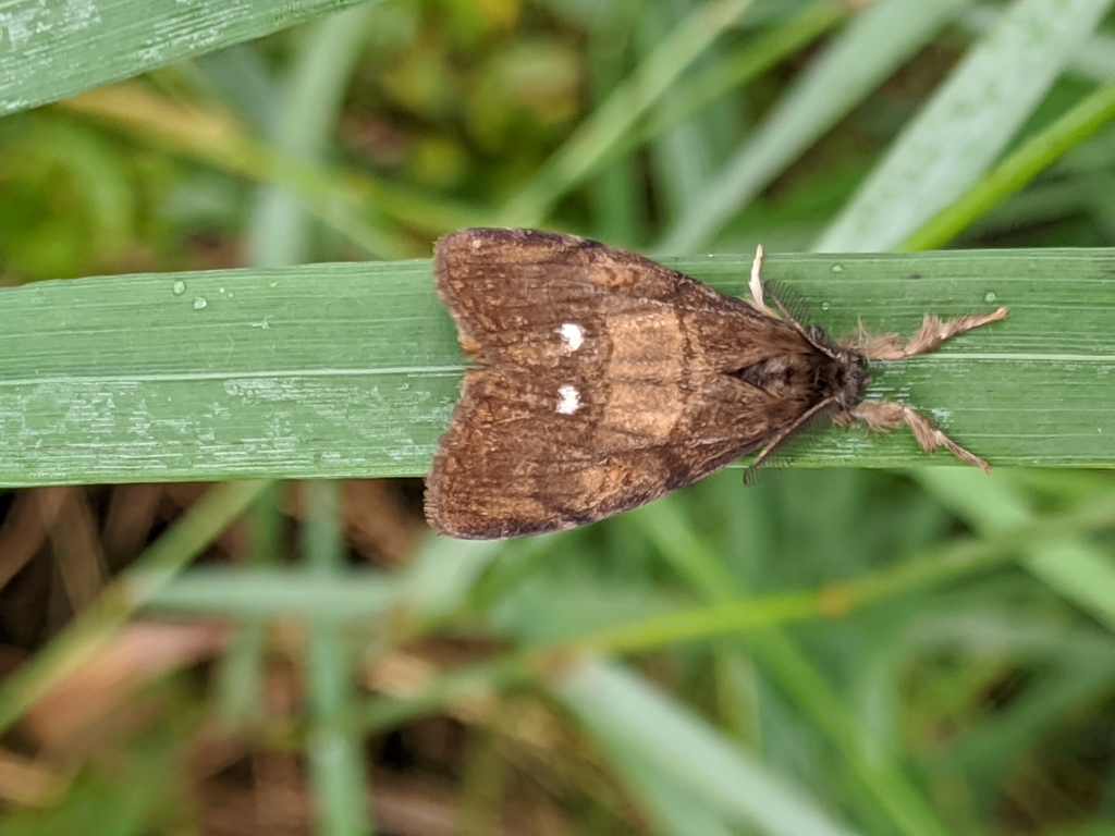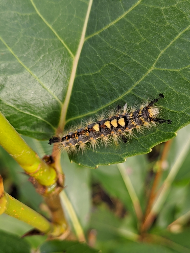 The caterpillars are quite hairy, and have tufts of tan hairs on their backs resembling tussocks of grass. Touching the hairs of the caterpillar can cause skin irritation in some people, so Wenninger advises using caution in a heavy Rusty Tussock Moth year.