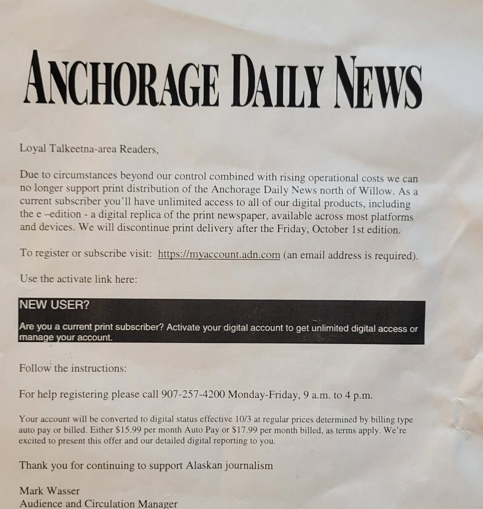 Readers of the Anchorage Daily News who prefer a physical newspaper in the Northern Susitna Valley will have to head south to get one.
