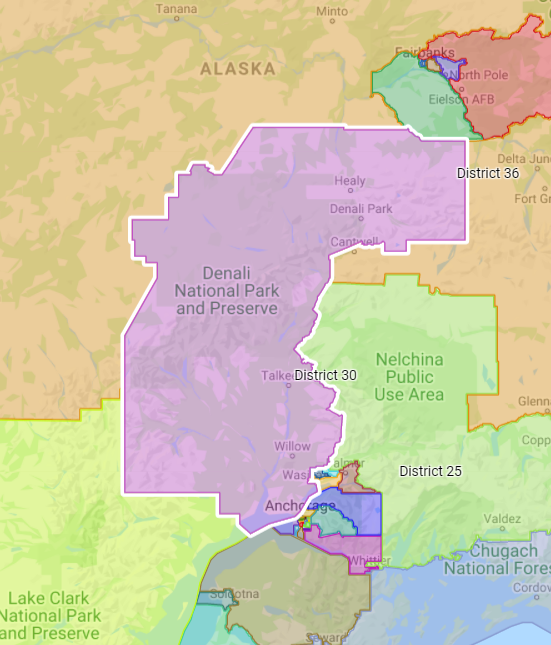 The new district stretches north to Anderson and south past Point MacKenzie. It includes, Houston, Big Lake, Talkeetna, Susitna, Trapper Creek, Chase, Denali, Healy, and Denali National Park. but not Cantwell. It also includes part of the Settler’s Bay area on Knik-Goose Bay Road.