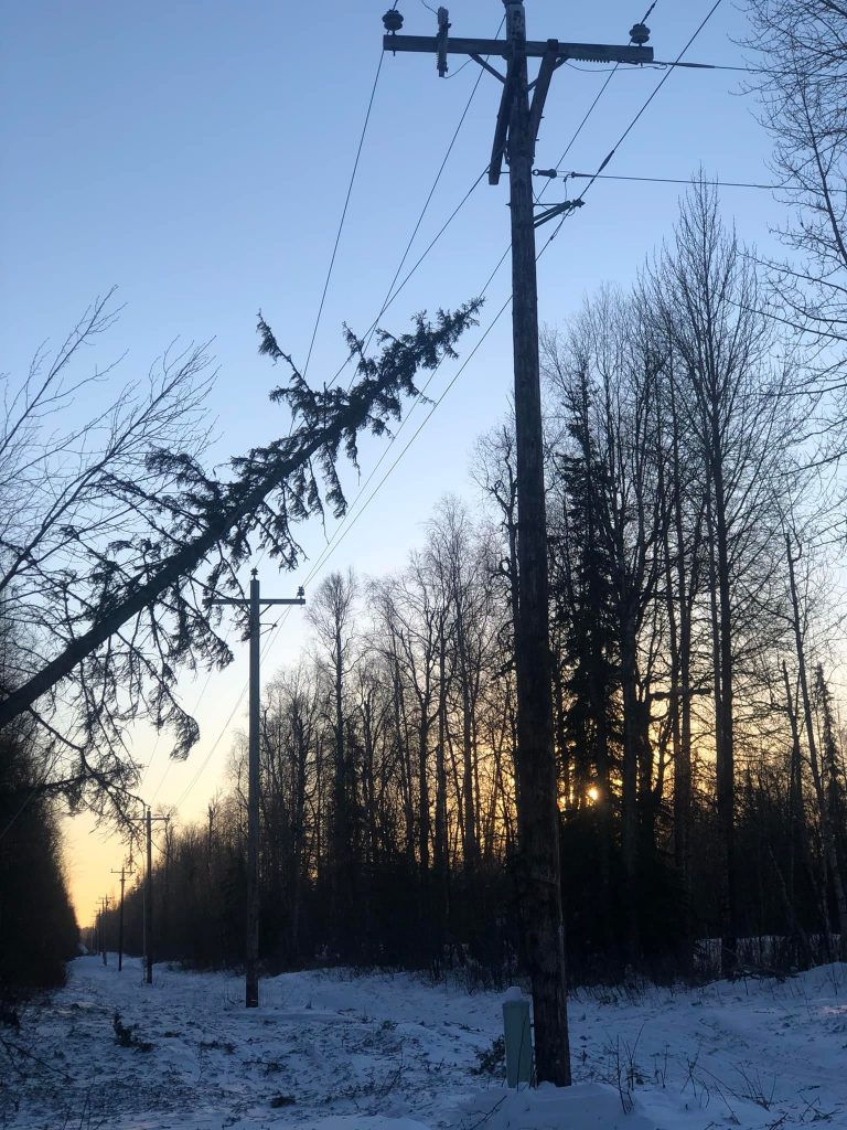 A tree that fell onto a powerline in Talkeetna as a result of the New Year’s weekend windstorm. Photo courtesy of James Graham.