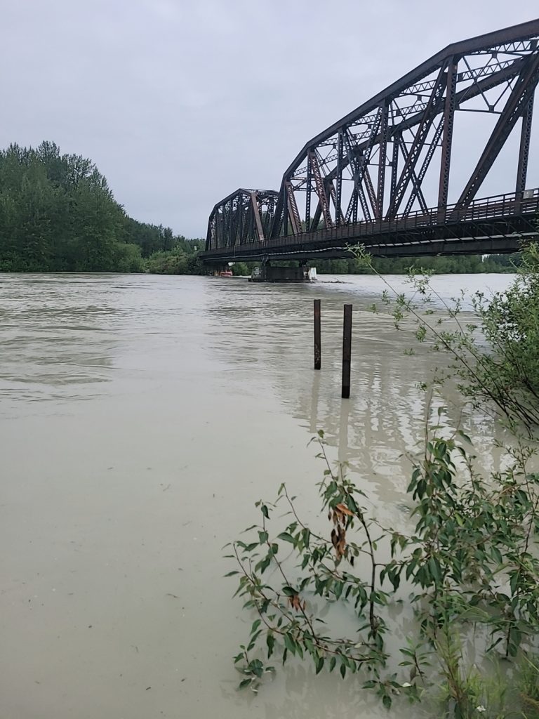 High water at the Talkeetna railroad bridge on July 20th, 2022 – Photo by Phillip Manning – KTNA