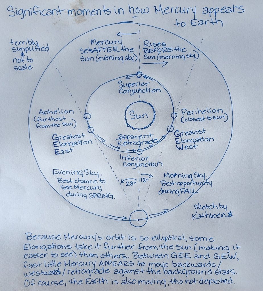 In this StarDate Susitna, Kathleen Fleming adds 3 more definitions to the glossary of astro-terms, and use those words in describing the motions of Mercury this week. Listen on-air or online Sunday during the 6pm announcements or Monday at 12:30pm. All shows are archived “forever” under the Susitna Writers Voice program, on KTNA.org.