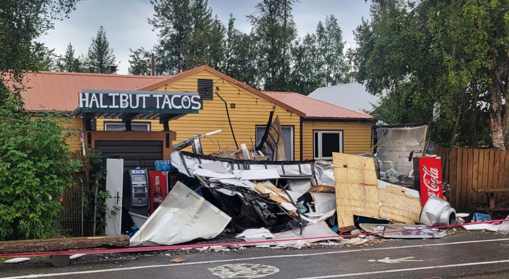 Immediately behind Talkeetna Tako is a residence owned by the Sheldon family. Reportedly, the home suffered significant damage. The Sheldons were not home at the time. Part of the roof of the truck landed in the Sheldons’ back yard.