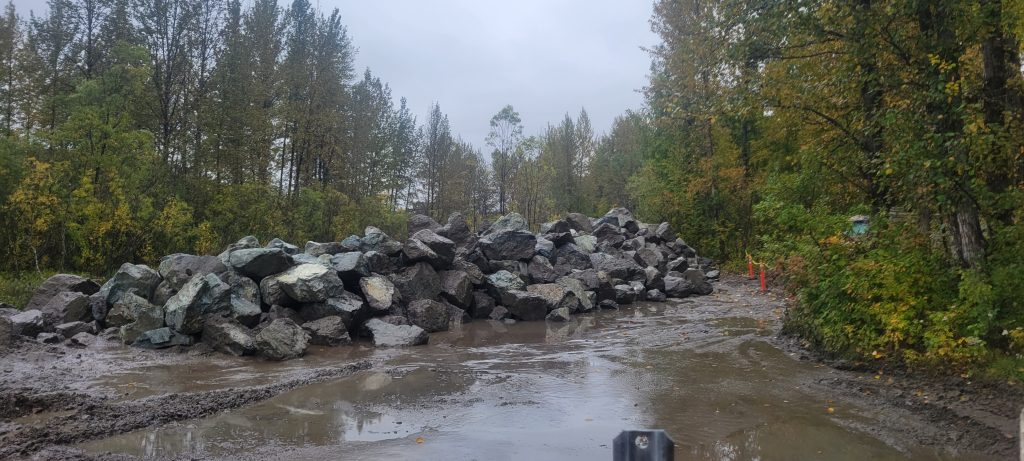 According to a statement from the Mat-Su Borough on Friday, 900 tons of riprap are being delivered. As of Monday, a significant amount had been staged near the damaged area of the revetment.