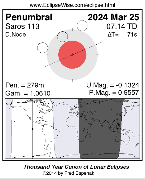 This is the graphic for the Penumbral Lunar Eclipse the evening of Sunday 3/24, which was completely cloudy. You can learn all about eclipses, lunar and solar, past and future, from EclipseWise.com.