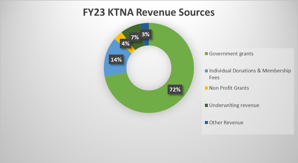 Note: The above pie chart shows a higher proportion of federal funds than normal. This is due to remaining funds from Covid-19 relief grants. The primary grant from the Corporation for Public Broadcasting accounts for approximately sixty percent of KTNA’s funding.