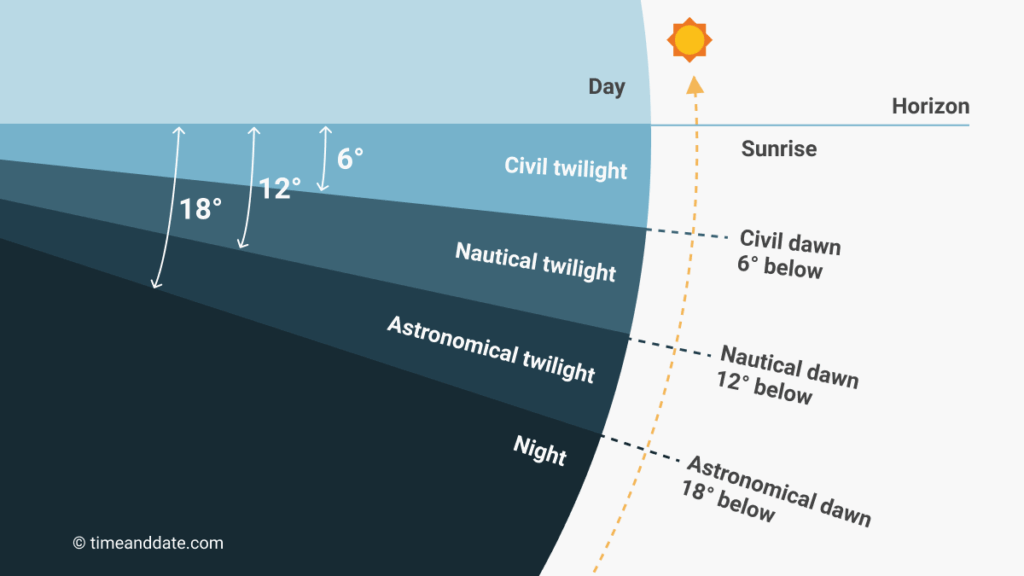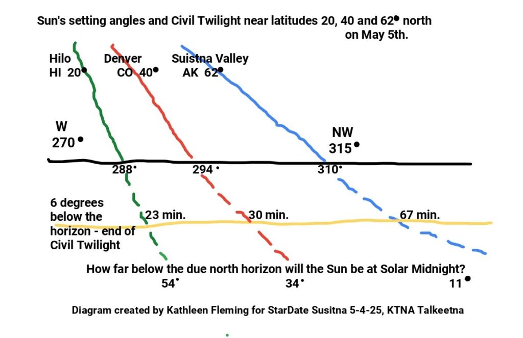 In the below image Kathleen hopes to show clearly how different Civil Twilight is in early May at 3 familiar latitudes.