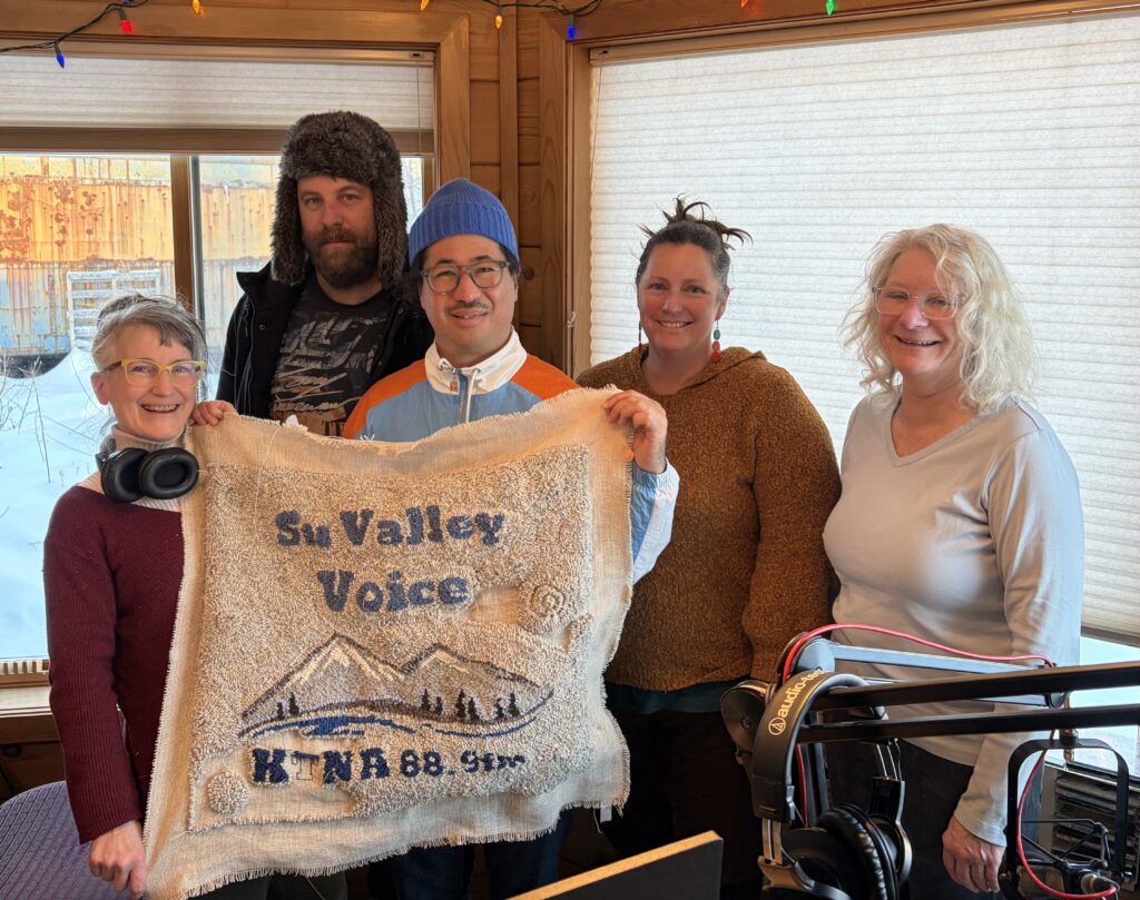 We ran out of time on this particular show to feature Fiber February, which also kicks off during the Ice Festival Schedule of events. In honor of this year’s art show (February 6) and workshops involving rug hooking (February 22), host Trisha Costello has been hard at work hooking a wall hanging for Su Valley Voice. Pictured with the nearly complete piece is host Trisha, then David and Nabu (of CHOIR! CHOIR! CHOIR!) Michelle Crow and Sandy Shoulders.