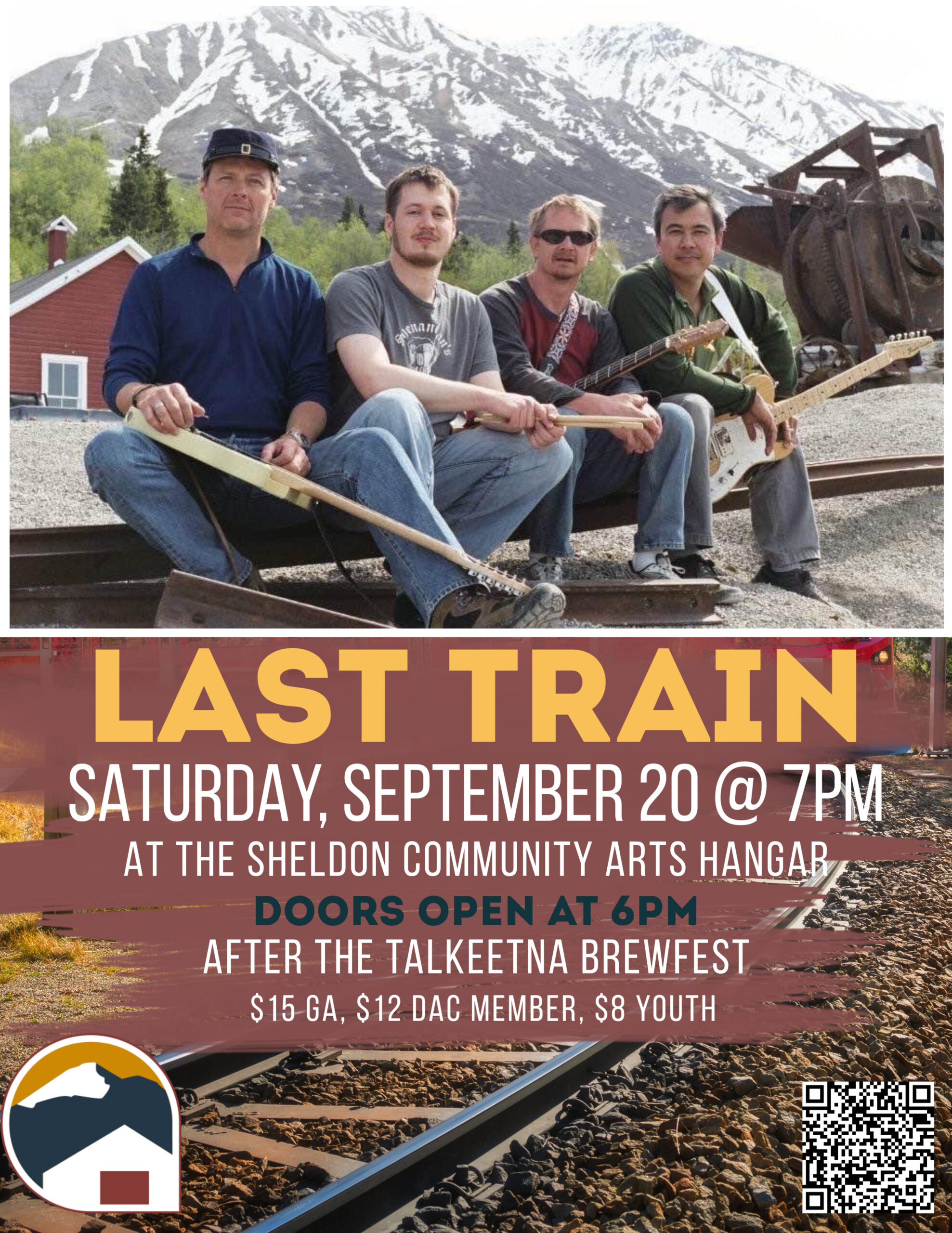 Sheldon Community Arts HangarDenali Arts Council hosts a concert with Last Train at the Sheldon Community Arts Hangar on Saturday, September 20th. Last Train has been shaped by the musical journey of its members, with influences ranging from roots rock, pop, and country to punk. Doors open at 6pm and the music starts at 7pm. More information and tickets available at denaliartscouncil.org.
