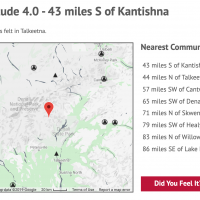 The Northern Susitna Valley felt a late-night earthquake shortly after midnight on Tuesday. According to the Alaska Earthquake Center, a magnitude 4.0 earthquake was detected around 12:38 am centered forty-four … Late-night earthquake felt in Northern Susitna Valley